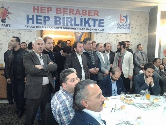 Güngören Ak parti ilçe kongresinde ilçe başkanı Ercüment Sever ve aday olduğunu açıklayan Atilla Kırali arasında başkanlık yarışı geçecek. Her iki adayında kendi taraftarları ile yaptıkları toplantılarda son dönemecler ve kulisler yapılırken bu yarış Ak parti için en bereketli yarış olacak. Güngören Ak parti kuruluşunda yer alanlar, yöneticiler, Belediye başkanı ve yardımcılarınında tam kadro seçimlere müdahil olduğu bu yarışta nefesler tutuldu. Kongre saati bekleniyor. Başkan Adayı Atilla Kırali ve yönetimi Green parkda verdikleri birlik berabnerlik yemeğine çok sayıda katılımcı katılarak bereket sofrasında yer aldılar. Bu akşamda Hurry in otelde ilçe başkanı Ercüğment Sever'de aynı şekilde yemekli toplantı düzenleyerek kongre sabahına girecekler. Bu kongre yarışında en bereketli yarış olduğu sofralardanda belli oldu. Ak parti girdiği her yarışda kazanırken konuşmacılar söylevlerindede tek kazananın Ak parti olacağınıda dile getirdiler.