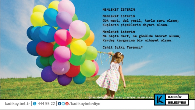 Cahit Sıtkı Tarancı’nın “Memleket İsterim”, Refik Durbaş’ın “Barış Koyun Çocukların Adını”, Melih Cevdet Anday’ın “Olsun da Gör”, Hasan İzzettin Dinamo’nun “Barış Şarkısı” şiirlerinden alıntıların yapıldığı billboardlara çocuklar ellerinde uçurtmalar ve balonlarla eşlik ediyor.