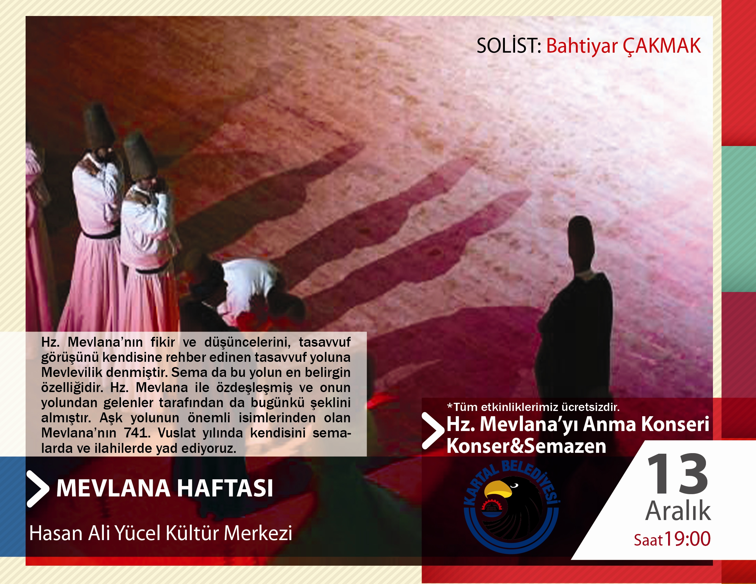 Kartal Belediyesi’nin Mevlana Haftası dolayısıyla düzenlediği etkinlikler kapsamında, Türk Sanat ve Tasavvuf Musikisi alanlarında gerekli eğitimleri alan ve birçok başarılı konsere imza atan sanatçı Bahtiyar Çakmak, 13 Aralık Cumartesi saat 19.00’da Hasan Ali Yücel Kültür Merkezi’nde “Hz. Mevlana’yı Anma Konseri”nde tasavvuf müziğinin en seçkin eserleriyle Kartallılarla buluşacak. Kartallıların ücretsiz dinleyebileceği “Hz. Mevlana’yı Anma Konseri”nde semazenler de gösteri yapacak.